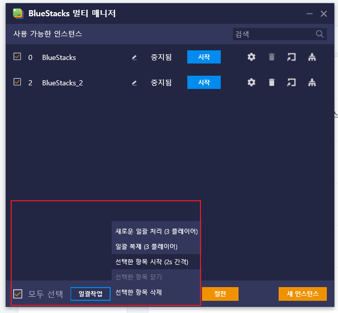 "모두 선택" 체크 후 일괄 작업 > 선택한 항목 시작(2s 간격)을 눌러서 두 개의 앱 플레이어를 실행시킨다.